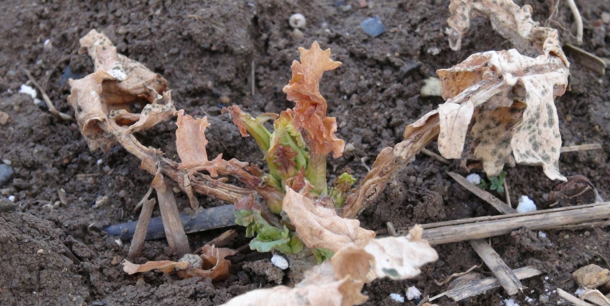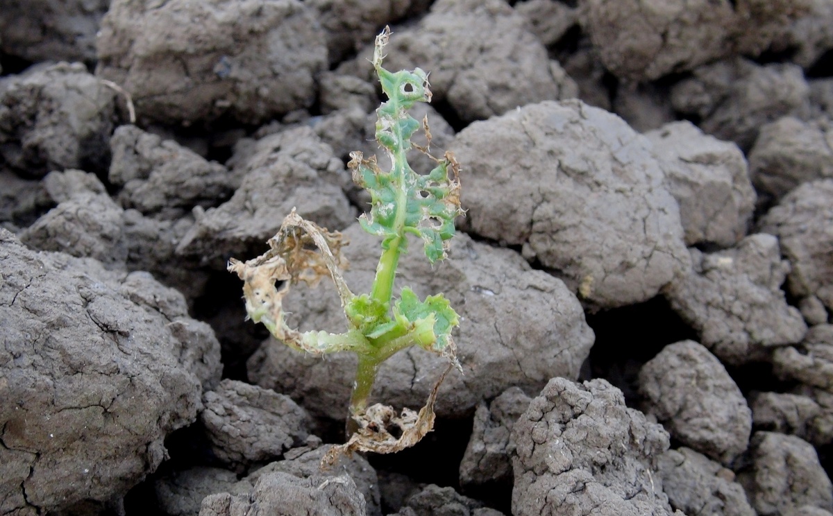 Srdéčko rostliny řepky na jaře silně poškozeno žírem larev dřepčíka olejkového
