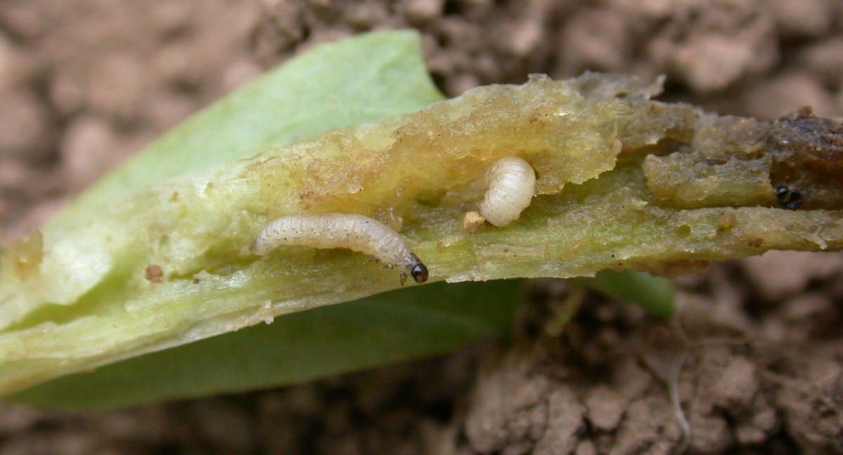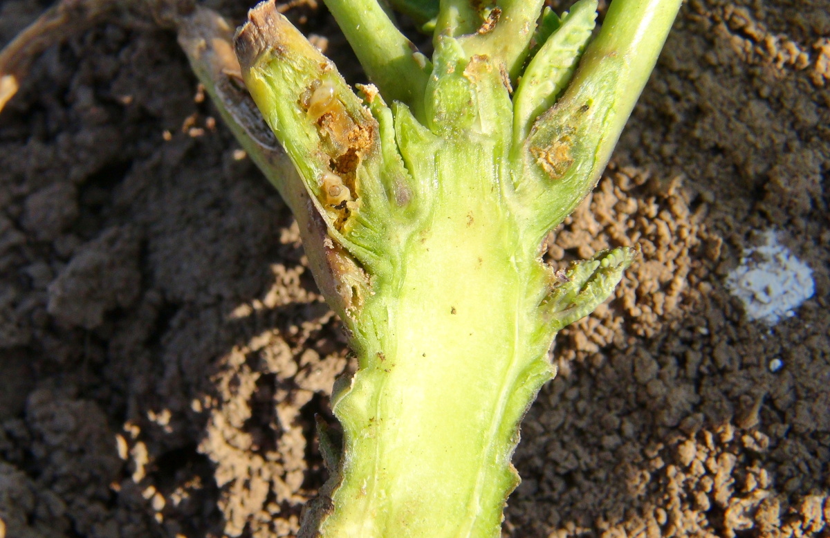 Poškození srdéčka řepky larvami dřepčíka v jarním období