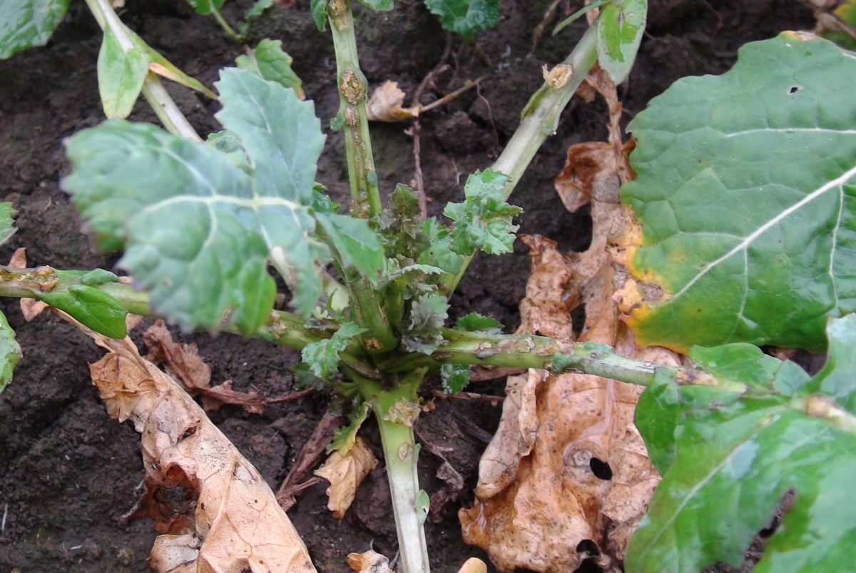 Silně poškozené rostliny žírem larev dřepčíka olejkového na podzim