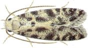 Křídla motýlů jsou světle šedá s červenohnědými a bílými skvrnami. Samičky kladou okolo 60 vajíček, vždy po jednom na zrno. Housenky jsou žlutavé a postupně vyžírají jednotlivá zrna, kterých během vývoje poškodí okolo 30. |