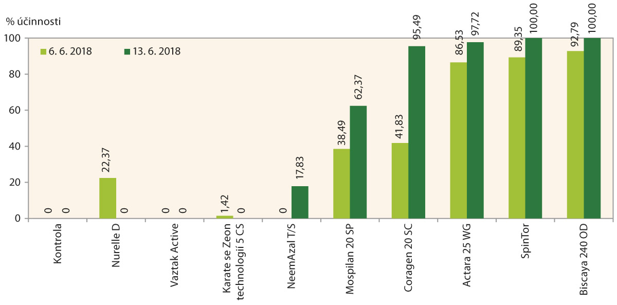 Graf 1 zobrazuje účinnost insekticidů na larvy LI - LIV, která byla vyhodnocena metodou podle Hendersona-Tiltona. Procento úbytku listové plochy žírem mandelinky tzv. defoliace v období od 5. 5. do 13. 6. 2018 je znázorněno v grafu 2. Pro lepší posouzení účinnosti byly pořízeny při druhém hodnocení po aplikaci obrázky detailů všech opakování každé varianty.