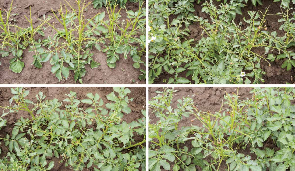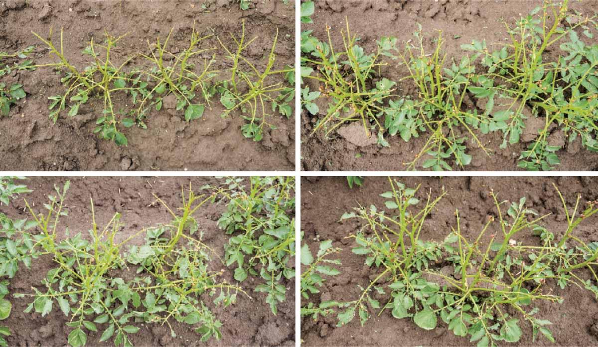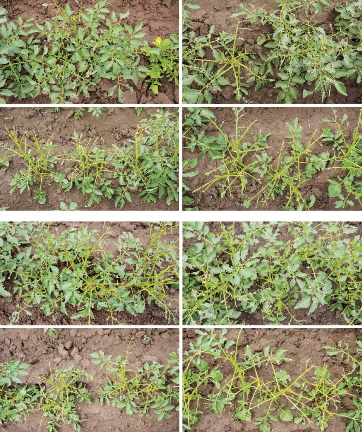 | Oba přípravky jsou ze skupiny pyretroidů. Účinnými látkami jsou u přípravku Vaztak Active alpha-cypermethrin a u přípravku Karate se Zeon technologií 5 CS lambda-cyhalothrin. Krátkou dobu po uvedení pyretroidů na trh a jejich plošném používání se vyselektovaly rezistentní populace mandelinky bramborové vůči všem účinným látkám z této skupiny. V současné době jsou tyto přípravky prakticky neúčinné. To potvrzují i provedené pokusy, kdy účinnost obou přípravků byla nulová, což je patrné i z uvedených obrázků, které se blíží neošetřené kontrole. Úbytek listové plochy byl mezi hodnoceními 24,7 % (Karate se Zeon technologií 5 CS) a 29,5 % (Vaztak Active). Zjištěné navýšení výnosů bylo nulové (Karate se Zeon technologií 5 CS) nebo velmi malé (Vaztak Active). |