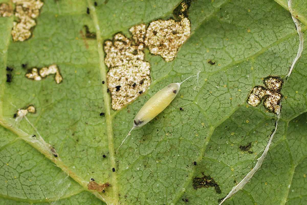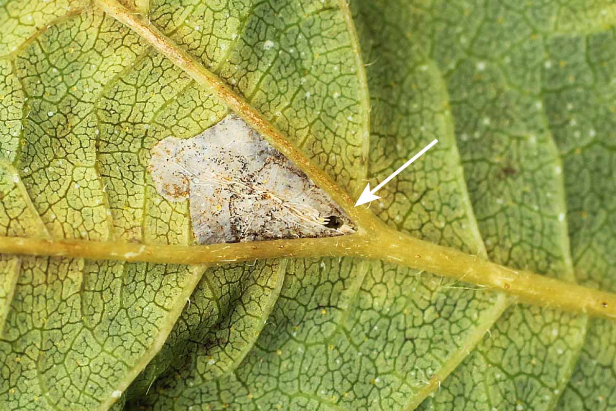 Mina v úžlabí žilek s otvorem, kterým vylezla housenka