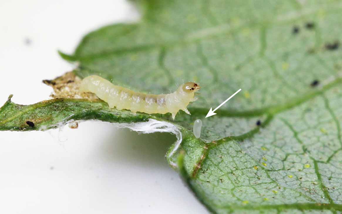 Paralyzovaná housenka s vajíčkem chalcidky
