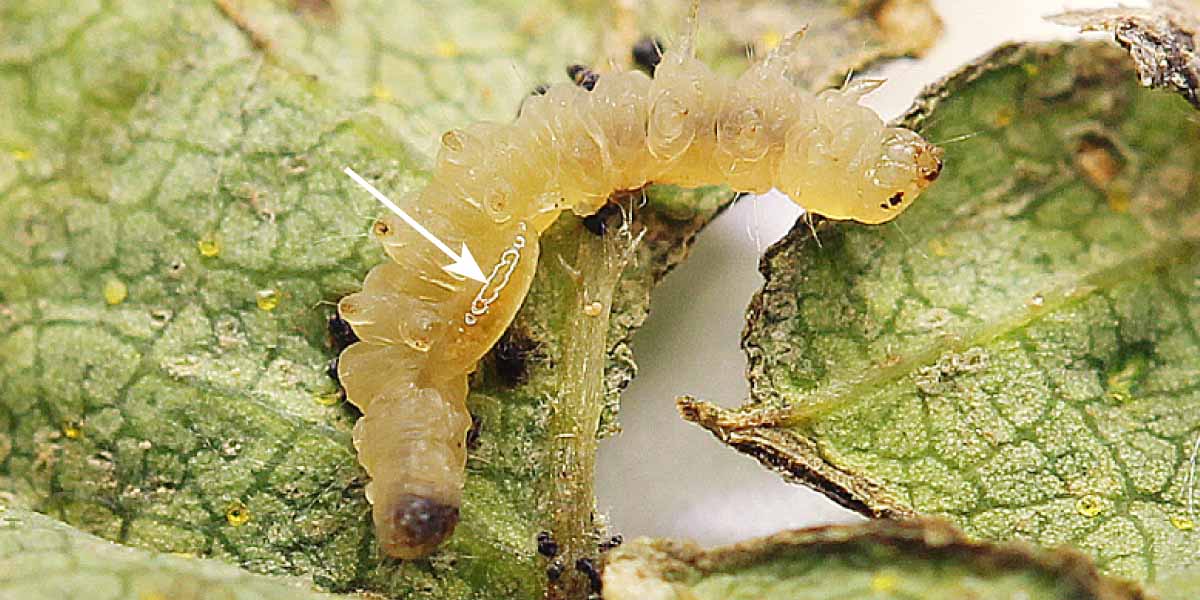 Larva chalcidky na těle housenky