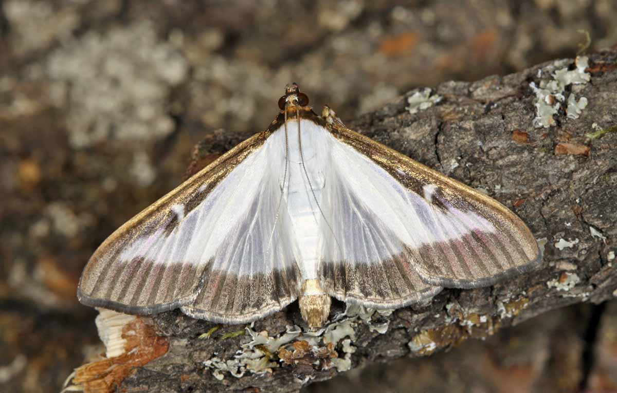 Obr. 1: Zavíječ zimostrázový (Cydalima perspectalis), obvykle zbarvený jedinec