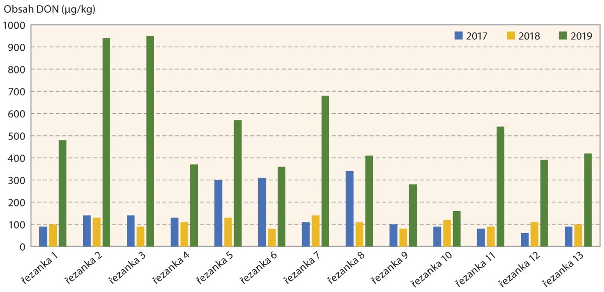 V posledních minimálně dvou letech si zemědělci zvykli, že zřejmě vlivem průběhu počasí byly záchyty mykotoxinů v našich podmínkách na poměrně nízké úrovni. První mykotoxikologické rozbory řezanek z letošní kukuřice by ovšem mohly být varováním. Jak plyne z grafu, některé hodnoty deoxynivalenolu jsou na docela vysoké úrovni (940, 950 µg/kg). První vzorky siláží se dostanou do laboratoří až počátkem příštího roku. V silážích mohou být záchyty mykotoxinů ještě větší než u řezanky, přestože byly dodrženy všechny standardy správného silážování. Vlivem fermentačního procesu se mohou uvolnit takzvané maskované mykotoxiny, jež byly vázané v rostlinných vakuolách v konjugované formě. Takto uvolněné mykotoxiny jsou přístupné detekčním metodám. V tomto ohledu nás může rok 2019 ještě překvapit.