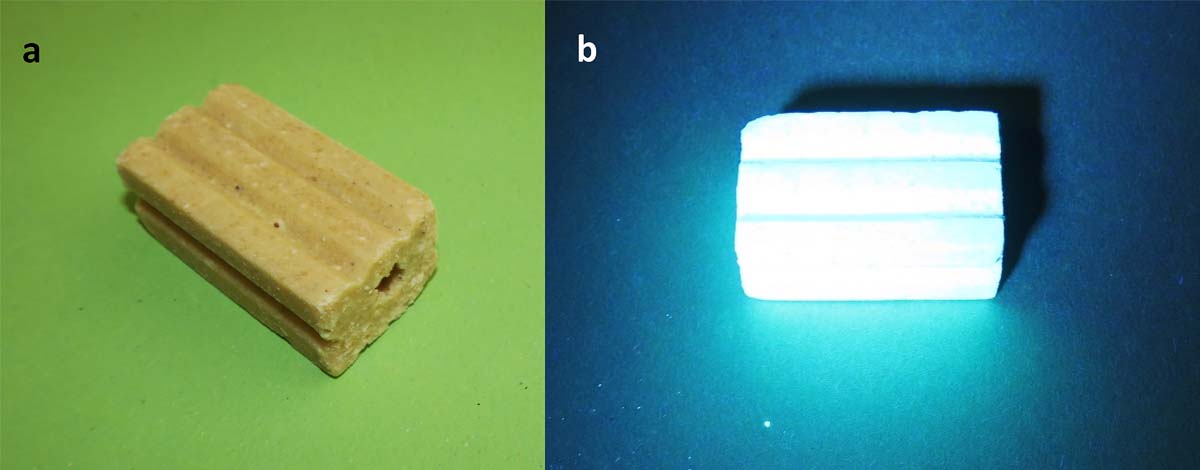 Obr. 2: Návnadové bloky Detex s fluorescenčním barvivem: (a) v běžném světle, (b) za tmy po osvícení UV baterkou