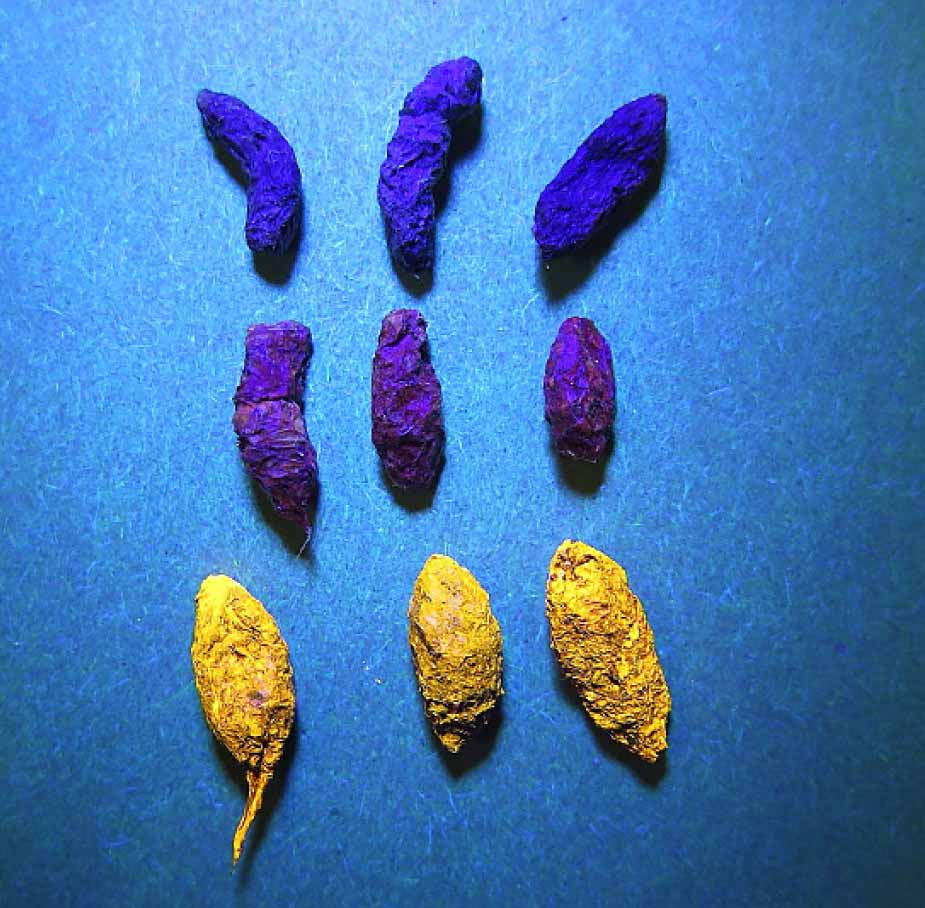 Dále jsou na trhu monitorovací návnady, které obsahují fluorescenční barvivo (např. Harmonix pasta, Detex; obr. 2). Po pozření této návnady a jejím průchodem trávicím traktem produkuje hlodavec fluorescenčně zbarvený trus (obr. 3), který je možné velmi snadno detekovat ve tmě pomocí speciální kapesní svítilny s UV zářením. Takto osvícený trus jasně září a je snadno viditelný i na vzdálenost několika metrů. Aktivitu hlodavce tedy sledujeme jednak na základě úbytku návnady a dále podle vyhledávání trusu. Stopování fluorescenčně zbarveného trusu navíc pomáhá najít místa průniku hlodavců do objektů nebo zkontrolovat tmavé nepřístupné prostory.