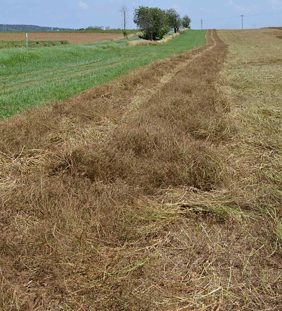 Posečením a nařádkováním porostu dochází k ukončení vegetace. U nás se pro tento účel využívají diskové žací stroje, žací kombinace nebo samochodné mačkače, vždy bez kondicionérů a válců. Pokud jsou ve výbavě žacího stroje kondicionéry, musí být před vlastním sečením demontovány. Vhodnější jsou sekací systémy s čelním i bočním sečením, kde je zajištěn dostatečný výkon a nedochází ke zbytečnému přejíždění řádků. Mezi řádky by měly zůstat minimální, ale zřetelné mezery (obr. 1) tak, aby řádek rychle a dostatečně vysychal, ale aby byl umožněn pojezd další mechanizace. Při přejíždění by totiž hrozilo vypadávání semen a při nepříznivém počasí hnití udusané hmoty.
