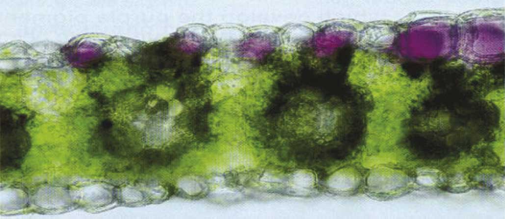 Obr. 2: Tento prierez tkaniva listu kukurice ukazuje nahromadené antokyanínové pigmenty. Všimnite si, že fialová pigmentácia sa vytvorila v hornej vrstve buniek a nemá vplyv na obsah chlorofylu v rastline.