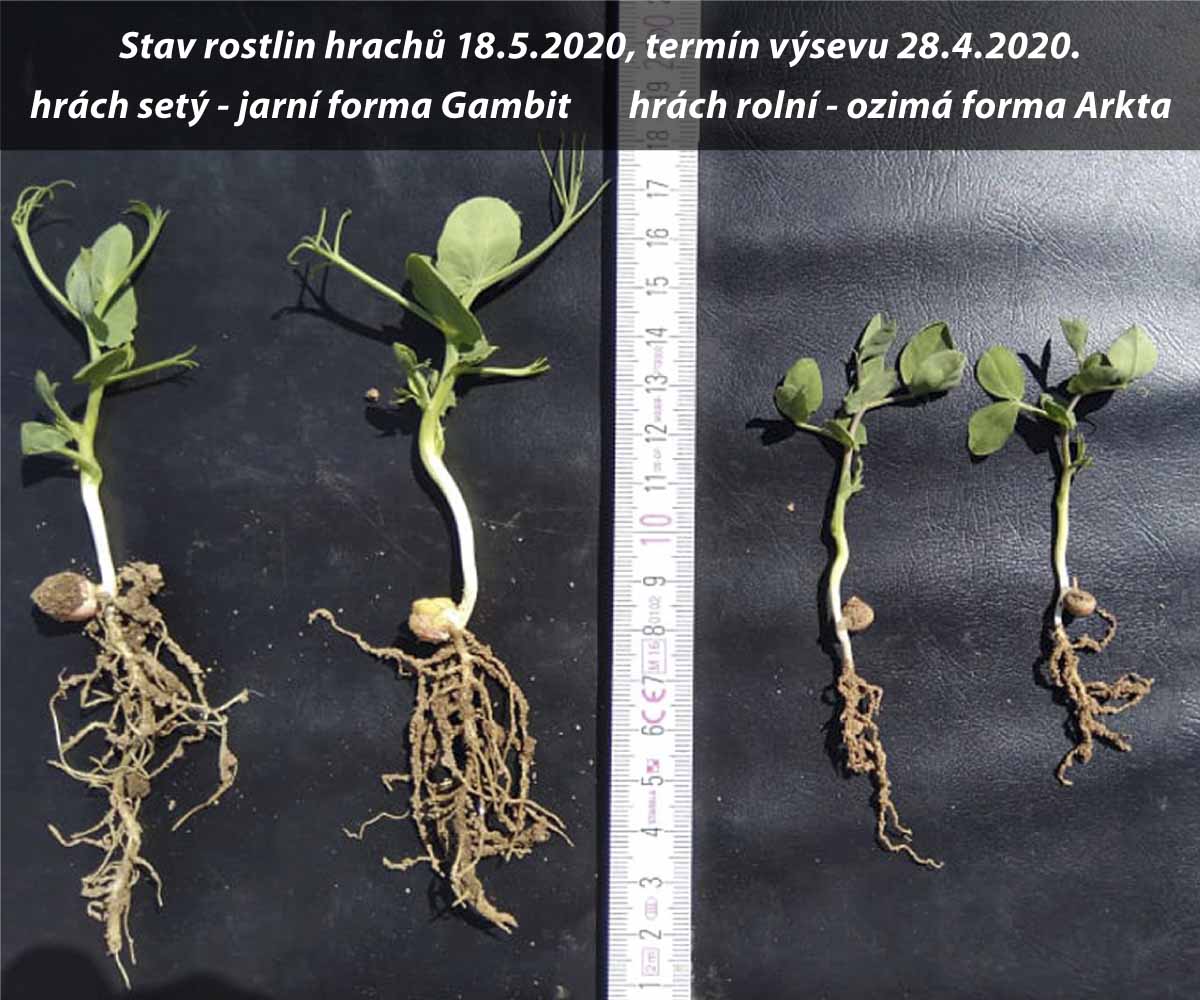 Rostliny hrachů a ovsu vyseté za kypřící radličky vzešly velmi dobře. Průměrný počet rostlin činil 18. 5. 2020 u hrachu setého 20 rostlin, u rolního 25 rostlin na 1 m2 a u ovsa poté 120 rostlin na 1 m2. Jarní forma hrachu setého vykazovala výrazně rychlejší dynamiku růstu ve srovnání s ozimou formou hrachu rolního (obr. 2). Ozimé formy hrachů vykazují obecně nižší růstovou dynamiku než formy jarní. U plošně vyseté hořčice dosahoval počet rostlin průměrně 50 rostlin na 1 m2. Béry v termínu hodnocení nevzcházely z důvodu nízkých teplot. Výsevy luskovin a ovsa za kypřící radličky (čistosevy), kdy rostliny řádkují, umožňují případné odplevelení mezi řádky (užší radličky nebo dlátka). V termínu hodnocení nebyly plevele v porostech přítomny.