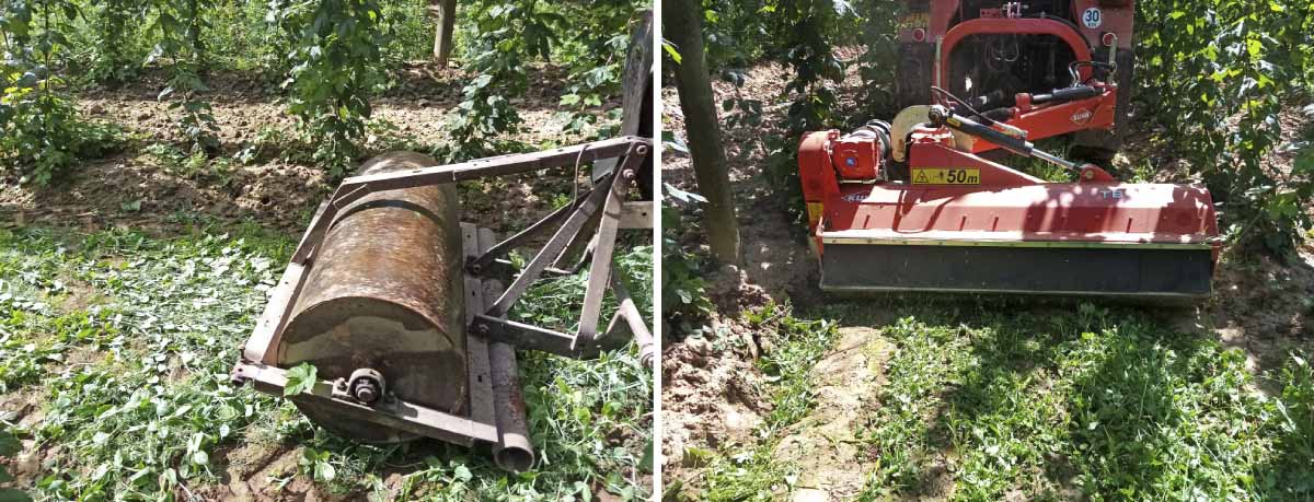 Obr. 4: Umrtvení porostů povalením (vlevo) a mulčováním