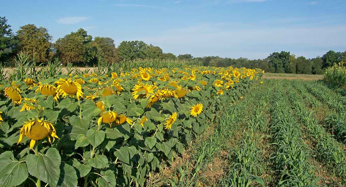 Vpravo - obrůstající čirok Bovital v roce 2012 - vlevo slunečnice pro energetické účely v podmínkách Zubří