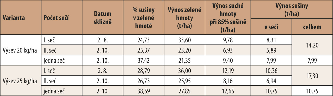 Obě varianty setí a sečné režimy byly sklizeny jako celé rostliny. Z výnosových výsledků zelené, suché hmoty a sušiny (tab. 2) dosáhl čirok nejvyššího výnosu sušiny 17,3 t/ha při dvousečné sklizni u varianty s výsevem 25 kg/ha. Varianta s výsevem 25 kg/ha se projevila vhodnější do klimatických a stanovištních podmínek Zubří. Současně bylo dosaženo i výnosu 61,95 t/ha zelené hmoty. Tato varianta s výsevem 25 kg/ha je výnosnější i u jednosečného využití porostu při sklizni 2. 10. 2017 (výnos sušiny u výsevu 25 kg/ha - 10,75 t/ha oproti variantě s výsevem 20 kg/ha - výnos sušiny 7,99 t/ha.