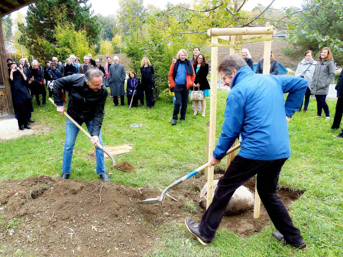 Obr. 4: Výsadby domácích druhů stromů, které inicioval a naplánoval Renzo Piano prováděné s umělci výstavy „About Trees“ v roce 2015; vlevo: Bernard Plattner, vedoucí projektu výstavby Centra Paula Klee, hlavní partner Renza Piana a jeho zástupce při výsadbě