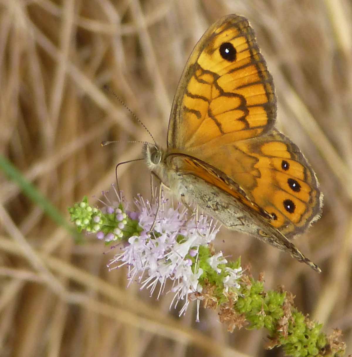 Obr. 6: Okáč zední (Lasiommata megera) saje nektar na mátě klasnaté (Mentha spicata); jeho housenky ožírají trávy, ale také obilniny - nejsou však známé škody; housenky u jiných druhů motýlů bývají odkázány na typické průvodce obilnin, violky rolní