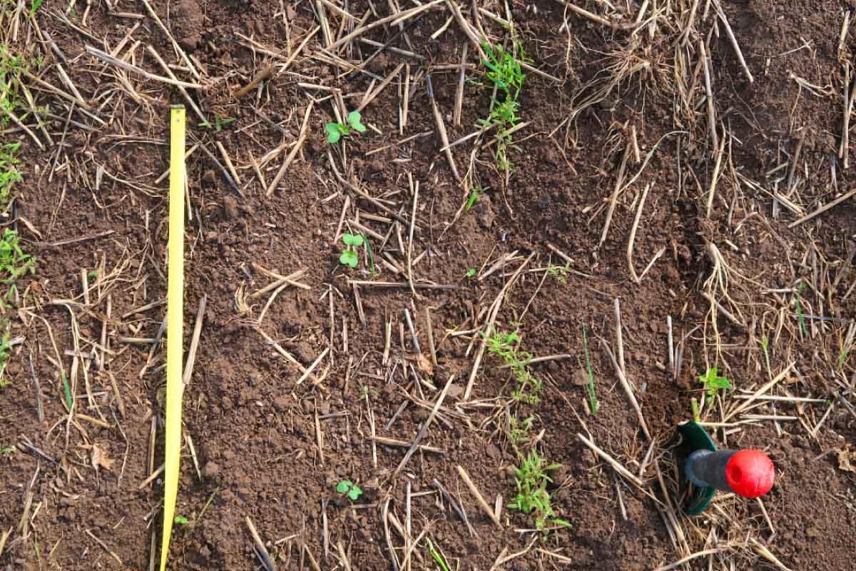 Obr. 2a: Vzešlé rostliny samostatně vysetých meziplodin svazenky vratičolisté a hořčice bílé vyseté do budoucího meziřádku cukrové řepy (budoucí řádek je naznačen lopatkou a metrem), 13. 9. 2019