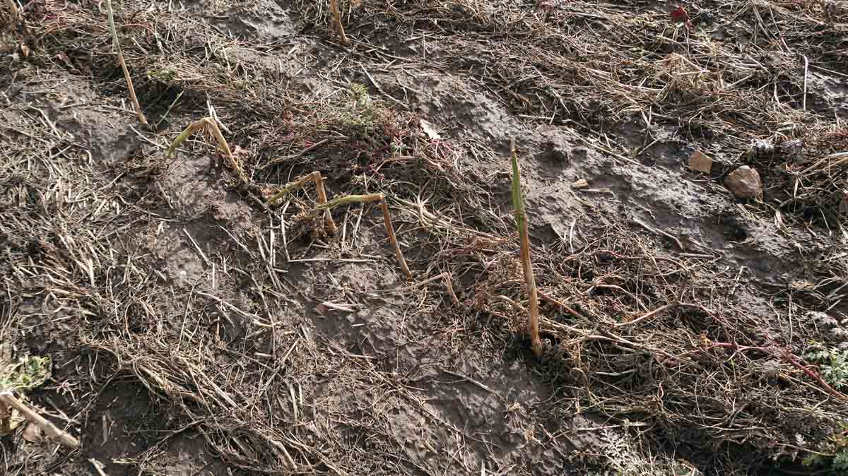 Obr. 3: Zmrzlý porost se samostatně vysévanými meziplodinami svazenkou vratičolistou a nízkým výsevkem hořčice bílé vyseté do budoucího meziřádku cukrové řepy, 12. 2. 2020