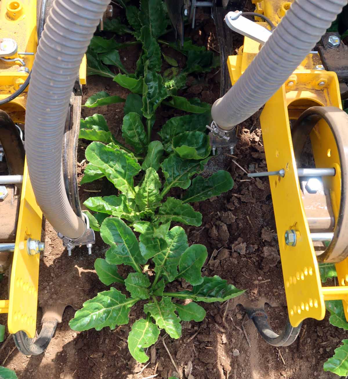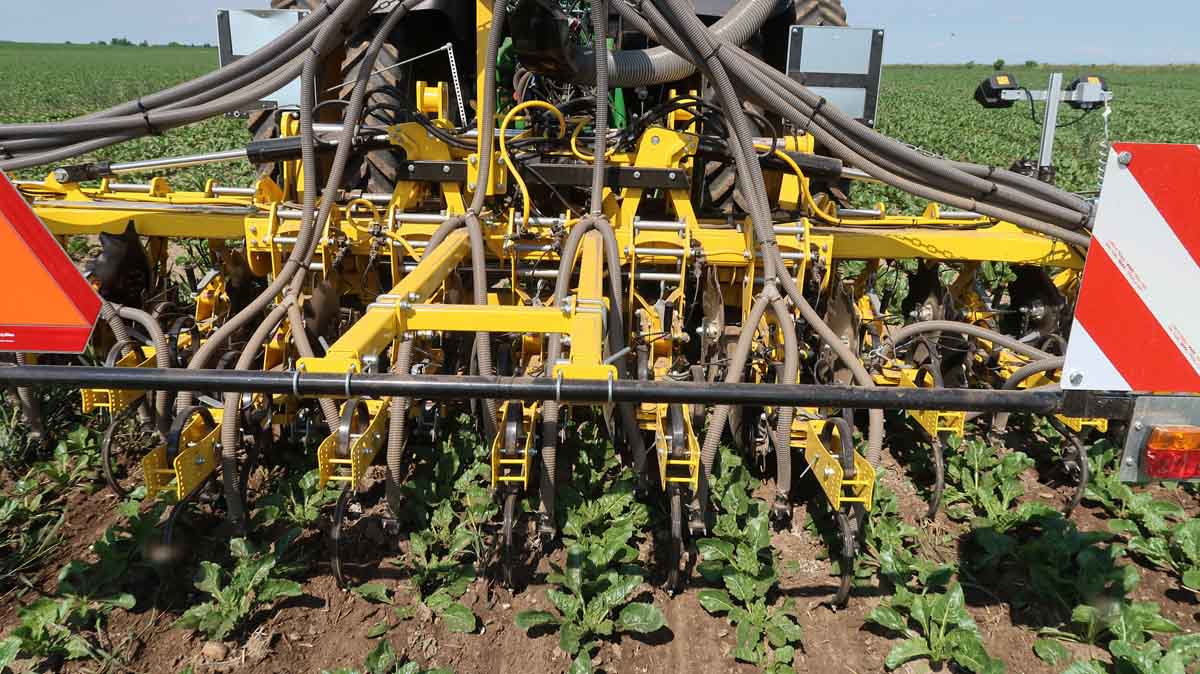 Obr. 5: Plečkování s přihnojením porostu, hnojivo je zapraveno dlátovou radličkou z každé strany řádku cukrové řepy