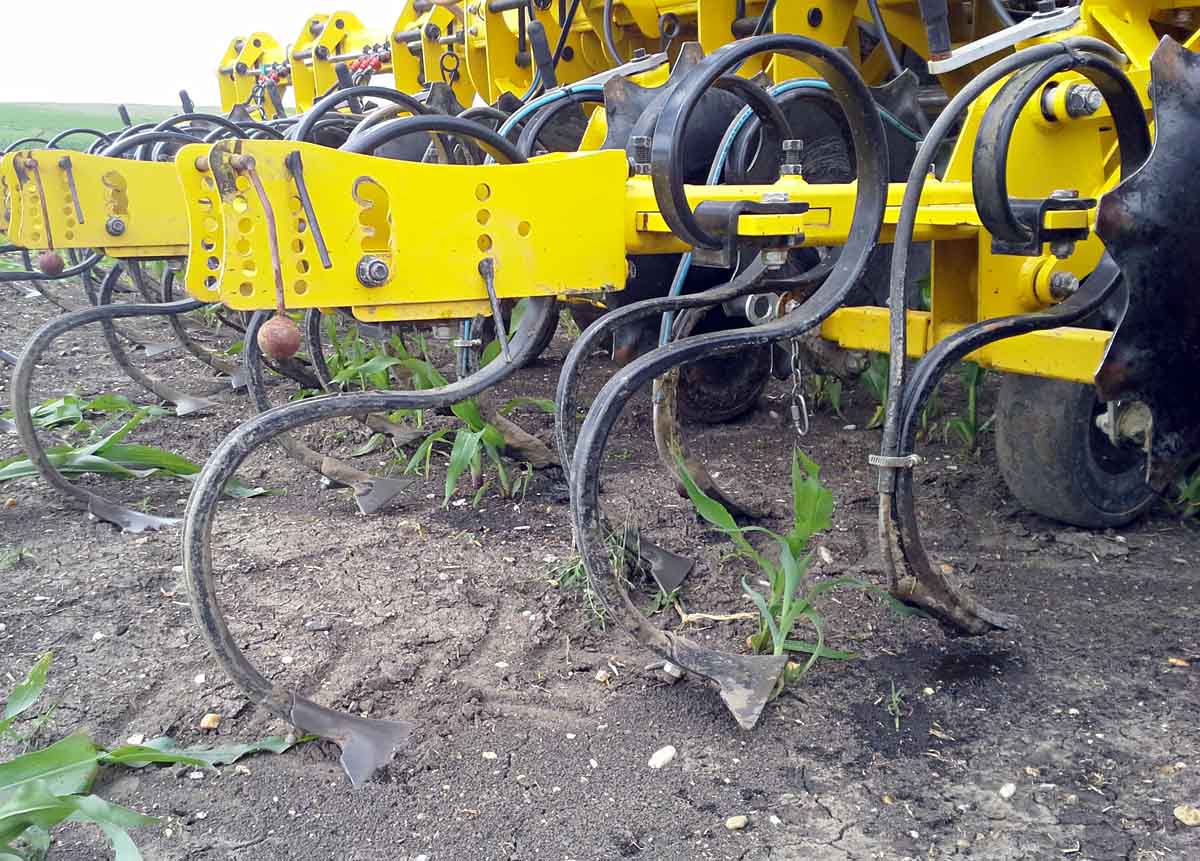 Výhodné pro rozrušení povrchové slévavosti jsou nové koncepce pracovních orgánů umístěných ve vozících (sekcích) kypřiče s několika různými typy radliček na pružných slupicích. Tím jsou kombinace šípovitých radliček (širší a užší) umístěných uprostřed kypřeného meziřádku a krajních dlátek, které bezpečně prokypřují půdu v blízkosti řádků kukuřice (obr. 3). Nezbytnou pomůckou nových technologií kultivace je použití naváděcích senzorů pro nepřetržitou ochranu porostu před poškozením a pro ulehčení obsluhy.