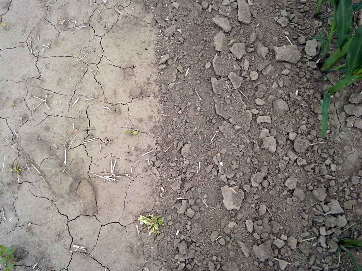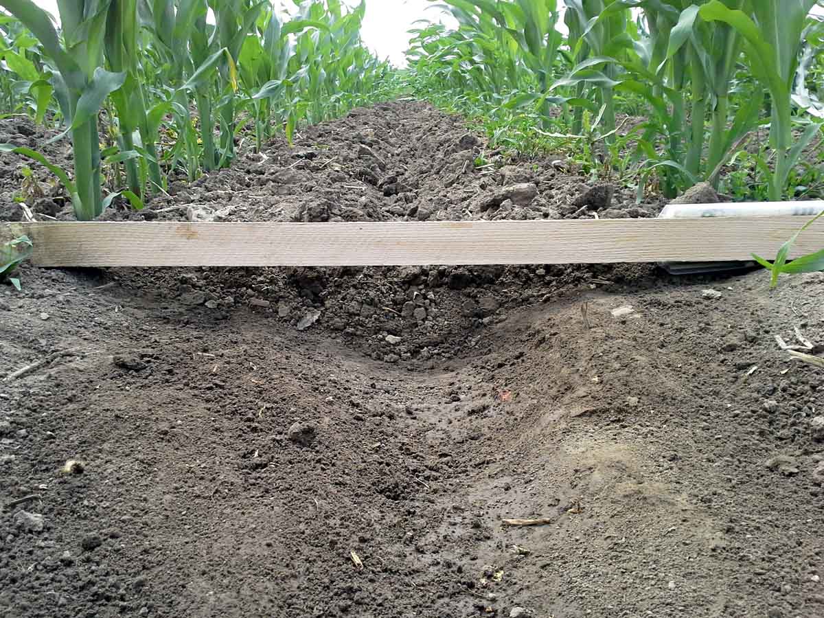 Současným trendem vývoje a potřebou praxe je vytvářet meziřádkovou kultivací protierozní funkci pro půdu s porostem kukuřice, která má nízkou ochrannou funkci. Náš výzkum prováděný v rámci spolupráce se zemědělským podnikem Agrodružstvo Klas Křičeň hospodařící na okrese Pardubice na těžkých půdách je směřován pro inovační vývoj variabilního prokypřování prostoru meziřádku (o šířce 50 cm) do různé hloubky, za cílené tvorby zasakovacího žlábku na středu meziřádku (obr. 2). Ten, zvláště při orientaci řádků kukuřice po vrstevnici, zajišťuje pro drsnost povrchu a významně zvýšenou pórovitost podstatně snadnější infiltraci (vsakování), a tím snižuje energii dešťových kapek při dopadu na povrch půdy, čímž brání jejímu rozplavení a odnosu.