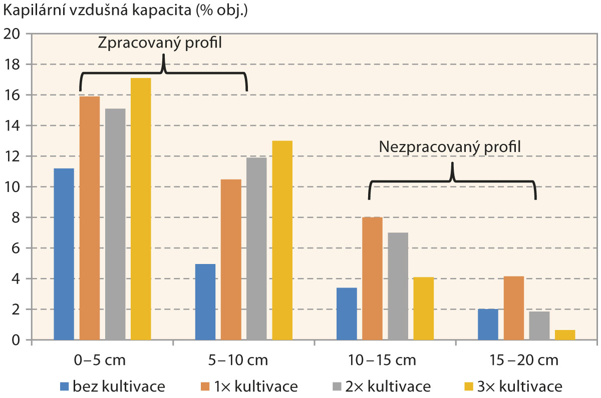 Účinek kultivace na rozrušení půdního škraloupu a provzdušnění půdy je obvykle pronikavý. Z našich dosavadních výsledků vyplývá, že prováděná meziřádková kultivace do hloubky 10 cm významně zvyšovala provzdušnění zpracovávaného profilu již po 1× provedeném ošetření (graf 1). S opakovanými vstupy se provzdušnění půdy zvyšovalo v horizontech aktivního prokypření 0–5 cm a 5–10 cm již slaběji. Naopak tomu bylo v přechodovém horizontu dna zpracování na nezpracovanou půdu v hloubce 10–15 cm, kde se s opakovaným vstupem snižoval objem vzduchu v pórech. V hlubším horizontu 15–20 cm bez aktivního kultivačního zásahu se provzdušnění zvýšilo pouze po 1× provedené kultivaci a opakovaná kultivace, zvláště 3× provedená, významně snižovala provzdušnění půdy. Dostavil se zde efekt negativního utužování půdy pracovními orgány radliček, který je znám u orby, kde se často označuje jako tvorba podplužní pánve. Opakovaná meziřádková kultivace může tedy působit protichůdně k cíli opatření, tedy pro zlepšování limitujících vlastností půd.