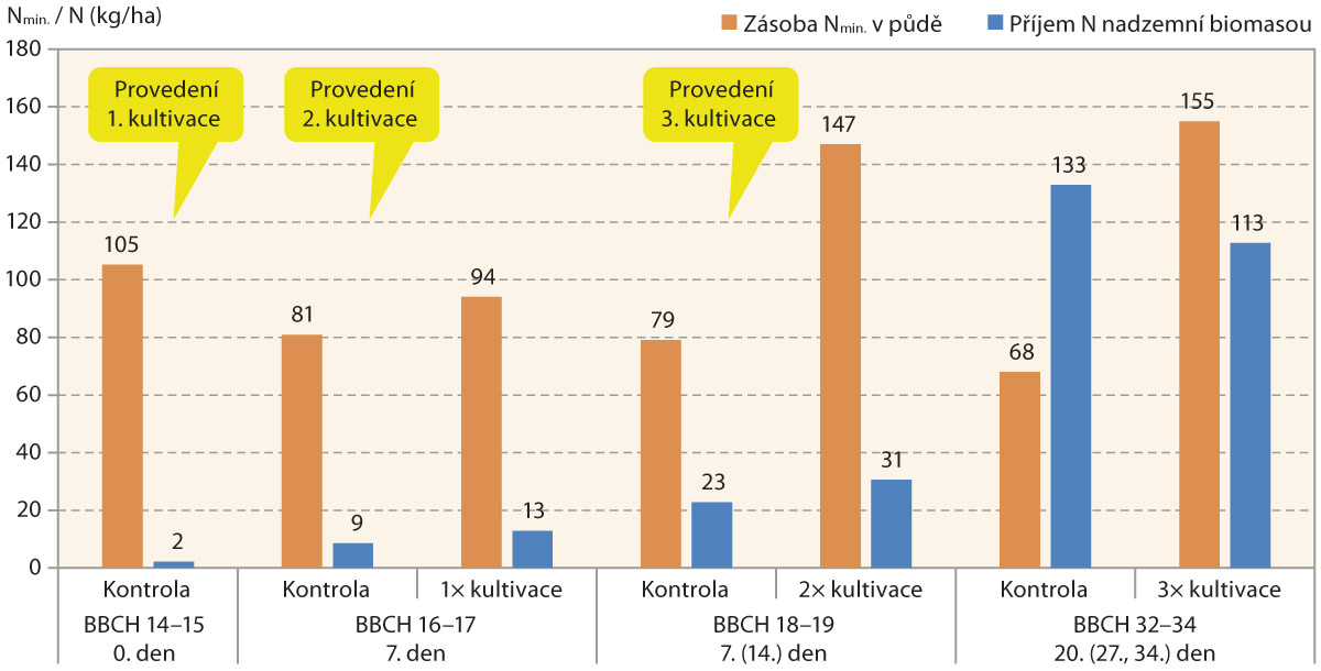 V provedeném pokusu v lokalitě Křičeň s těžkou půdou byl na podzim aplikován hnůj v dávce 40 t/ha, který poskytl zdroj snadno rozložitelné organické hmoty. Po kultivaci kukuřice se významně zvyšoval obsah Nmin.v půdě (graf 2). První kultivace (časný termín) byla provedena dne 30. 5. ve vyvinutém 4.–5. listu (BBCH 14–15) kukuřice. Následně 7. den, kdy porosty vyvinuly 6.–7. list (BBCH 16–17), vykazovala kultivovaná půda v meziřádku o 13 kg/ha vyšší zásobu Nmin. než nekultivovaná kontrola. Rovněž bylo patrné, že mladé rostliny reagovaly na provzdušnění a zpřístupnění Nmin. v půdě a zvýšily příjem dusíku o 4 kg/ha oproti nekultivované kontrole. Po provedení druhé kultivace v období vyvinutého 6.–7. listu dosáhly porosty po následujících 7 dnech vývoje 8.–9. listu. Po druhé kultivaci se dostavila extrémně intenzivní mineralizace dostupných organických forem dusíku v půdě. Zpřístupněno bylo pro porost kukuřice opakovanou kultivací 68 kg Nmin. na 1 ha. Zároveň příjem dusíku nadzemní biomasou kukuřice se po kultivaci provedené 2× zvýšil o 8 kg N/ha oproti kontrole. Výkon mikrobiální mineralizace byl v tuto dobu významně vyšší než příjmová a asimilační schopnost rostlin, ačkoliv převládaly příznivé povětrnostní podmínky. Následovalo provedení třetí kultivace (pozdní termín) v 8.–9. listu kukuřice, které se projevilo za 20 dní v období vytvořeného 2.–4. kolénka (BBCH 32–34) zpřístupněním 87 kg Nmin. na 1 ha. V tomto období intenzivního růstu nadzemní biomasy však nastal pokles příjmové schopnosti rostlin na vícekrát kultivované půdě oproti nekultivované kontrole. Zřejmě kultivací vytvořená velmi dobrá zásoba Nmin. (obsah 50 mg/kg zeminy) způsobila dočasnou toxicitu nebo neatraktivnost pro část kořenů umístěných v povrchovém profilu kultivované půdy. Určitý vliv na nižší příjem dusíku rostlinami po pozdní a v pořadí 3. kultivaci mělo také vyšší vysychání povrchu kultivované půdy.