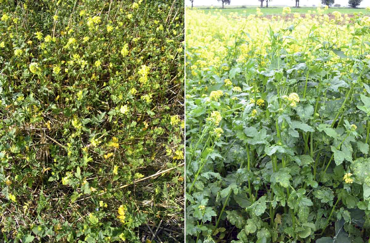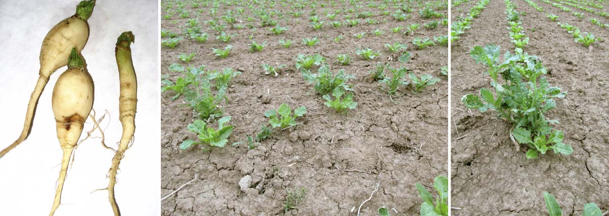 Obr. 6: U rostlin ředkve olejné dochází k tvorbě ztloustlých kořenů (vlevo), které se mohou pomaleji rozkládat v půdě a zvyšují riziko nevymrznutí rostlin, např. v systémech setí cukrové řepy do vymrzající ředkve jako strniskové meziplodiny (vpravo, SRN jaro 2016)