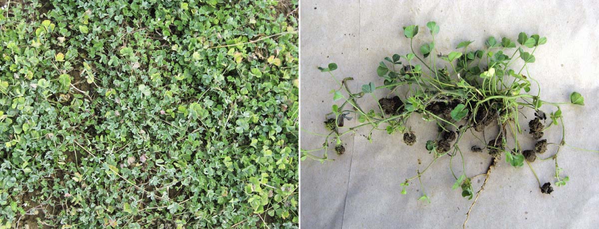 Obr. 7: Rostliny jetele podzemního dobře pokrývají povrch půdy (vlevo); jeho vlastnost zavrtávat květní hlávky po odkvětu pod zem (vpravo) zajišťuje i dlouhověkost porostu na stanovišti