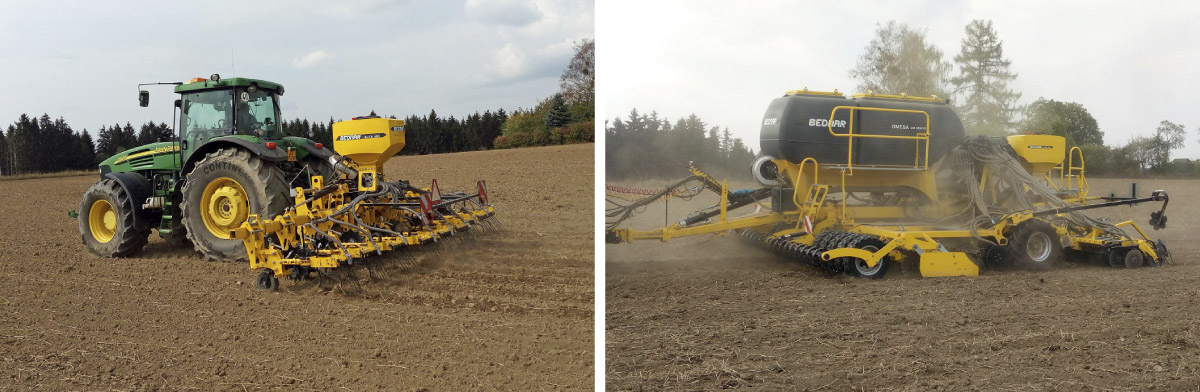 V roce 2018 byl ověřován systém výsevu pomocných plodin do pásů modifikovanou plečkou firmy BEDNAR FMT (obr. 3). V rámci experimentů byl proveden výsev vybraných druhů plodin do pásu přímo po provedení plošného zpracování půdy strojem Terraland do hloubky 180 mm (předplodinou byla ozimá pšenice). Technologie byla koncipována pro pěstování kukuřice, proto rozteč plečkovacích sekcí činila 0,75 m. Osivo bylo při pásovém výsevu plečkou pneumaticky transportováno ze zásobníku umístěného na rámu plečky za kypřící sekce a pomocí nárazových deflektorů bylo směřováno za kypřící orgány. Kontrolní variantu představovaly pásové výsevy založené klasickým secím strojem Omega o záběru 6 m (obr. 3). U secího stroje byl výsev pásů proveden vždy třemi secími botkami s roztečí 125 mm a následné tři byly zaslepeny.