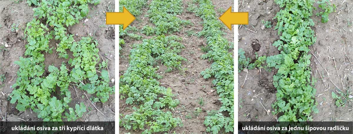 Pásový výsev plečkou vedl ve srovnání s výsevem pomocí secího stroje k tvorbě užšího pásu pokrytého rostlinami. Tvorba užšího pásu při založení plečkou je typické při ukládání osiva za šípovou radličku. Zemina obtékající po stranách slupici radličky funguje jako boční omezovač rozptylu proudu osiva transportovaného proudem vzduchu za radličku do stran a zároveň dobře zakrývá vysévané osivo. To je výhodné zejména při výsevu semen s větším průměrem, které vyžaduje dobré zakrytí půdou. Šípová radlička rovněž vytváří rovné a utužené dno v kypřeném pásu, které funguje jako seťového lože (obr. 4). Zvětšení rozptylu semen při výsevu za radličku lze provést umístěním rozptylovače osiva do spodních částí slupice (obdoba výsevních radliček), ale využít lze i pneumatický soustředný tok osiva přímo za kypřící dlátka. Kolem nich rovněž dochází k obtékání zeminy, ale užší pracovní šířka umožňuje jejich vícenásobné umístění v sekci. Obrázek 5 dokumentuje šířku osetého pásu hořčice bílé při výsevu za šípovou radličku a za tři kypřící dlátka v sekci.