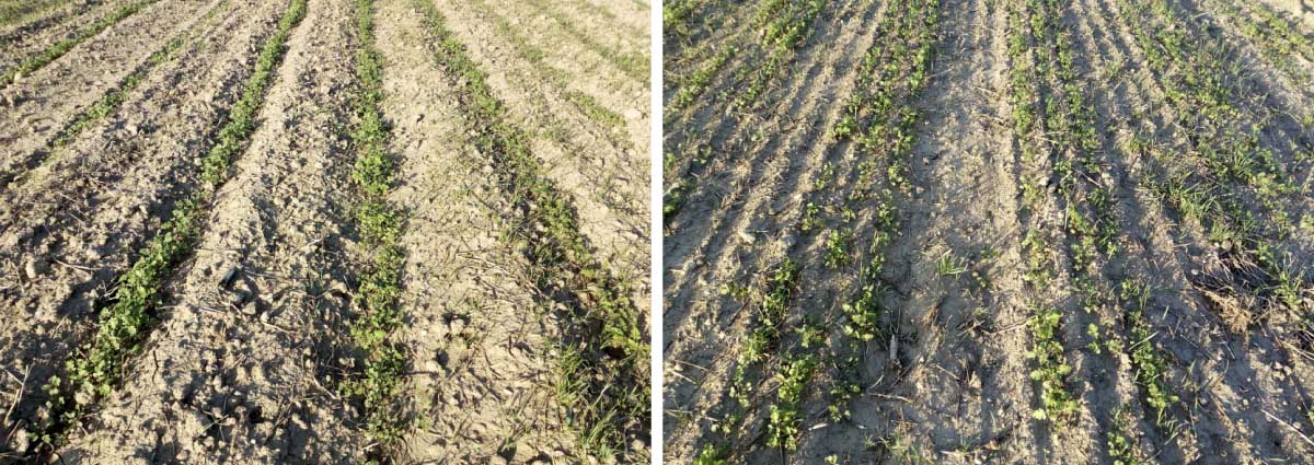Obr. 6: Stav porostů hořčice bílé založených plečkou (vlevo) a secím strojem (vpravo) dne 5. 10. 2018