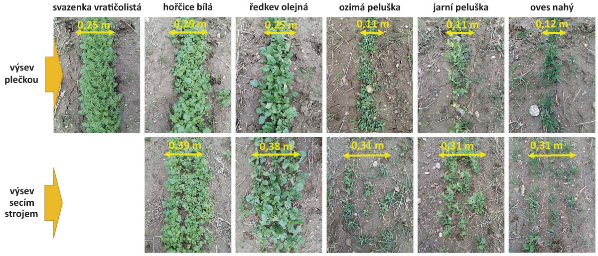 Při druhém hodnocení vývoje porostů byl opět prokázán vliv výsevu na celkovou šířku vysetého pásu pokrytého nadzemní biomasou (tab. 3). Hustější výsev do užšího řádku však průkazně ovlivnil výšku rostlin u hořčice bílé a ředkve olejné. Produkce nadzemní biomasy u hořčice bílé a svazenky vratičolisté vykazovala u obou způsobů založení obdobné hodnoty. Zajímané výsledky však poskytla produkce nadzemní biomasy na jednotku plochy u pelušek, kde, ačkoliv neprůkazně, byla vyšší produkce stanovena na plochách založených plečkou. Stav vybraných porostů meziplodin založených do pásu v druhém termínu hodnocení v závislosti na způsobu založení dokumentuje obrázek 8.