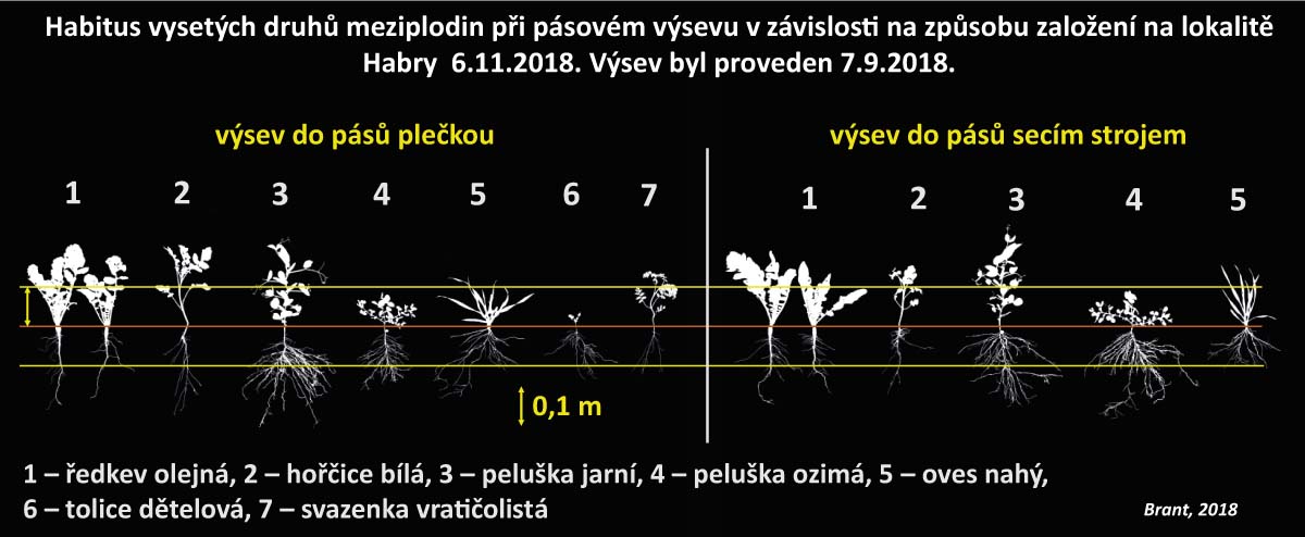 Pokryvnost porostů u hořčice bílé a ředkve olejné byla u obou hodnocených variant velmi podobná (tab. 2), ale produkce nadzemní biomasy byla po založení plečkou výrazně vyšší. I zde mohla být důvodem větší hloubka setí při suchém průběhu počasí a následně lepší infiltrace následných srážek do zóny kypřeného pásu. Stav porostů hořčice bílé v závislosti na způsobu založení dokumentuje obrázek 6. Z obrázku je rovněž dobře patný stav povrchu půdy v neosetých částech pozemku. Zejména při využití secího stroje k pásovému výsevu dochází k výraznějšímu tlaku na půdu v budoucím řádku kukuřice a zvyšuje se riziko poškození půdní struktury. Za velmi pozitivní lze považovat skutečnost, že pásový výsev plečkou vedl i k dobrému vývoji rostlin tolice dětelové. Stav porostů v zasetém meziřádku plečkou a pokryvnost povrchu půdy v budoucím meziřádku na hodnocených variantách 5. 10. 2018 dokumentuje obrázek 7.