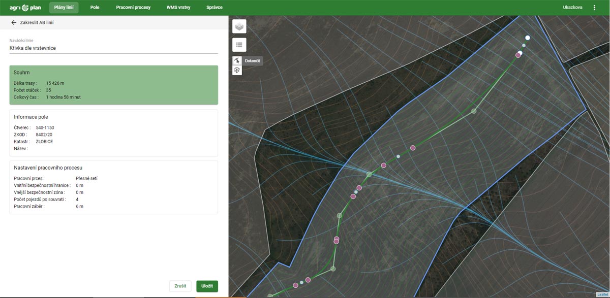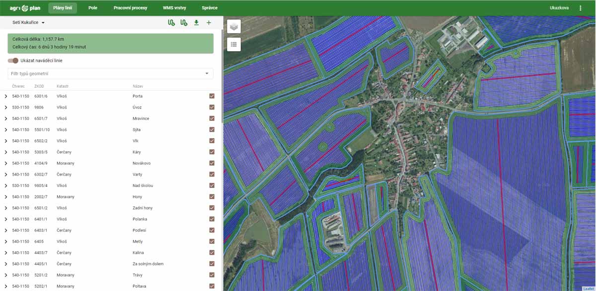 Po provedení importu a případné předpřípravě půdních bloků je možno přistoupit k vlastnímu plánování navigačních linií. Základní a ojedinělou funkcionalitou je hromadné plánování linií pro všechny zvolené půdní bloky najednou. Jediným kliknutím zvolíme například pracovní proces „Setí šestimetrovým secím strojem“, načež software naplánuje linie včetně souvraťových křivek na všech polích. Dále můžeme přistoupit k volbě pracovního procesu „Podmítka 12 metrů“ a nastavíme, v jakém úhlu mají linie být vygenerovány od „secí“ linky a software nám na daná pole automaticky naplánuje linie včetně souvraťových na všechna pole. Jen pouhými několika kliky je možné naplánovat pohyb veškerých strojů po všech půdních blocích. Automaticky vygenerované linie je pak možno následně jakkoliv ručně upravovat, tedy měnit směr a polohu v závislosti na uvážení uživatele a znalostech lokality. Při provádění ručních úprav je vždy vidět aktuální statistika efektivity pohybu po daném půdním bloku, tedy počet otoček, celkové najeté kilometry a potřebný čas jízdy. Každá ruční změna je tak vždy okamžitě vyhodnocena a uživatel ihned vidí její dopad na efektivitu pohybu po pozemku.