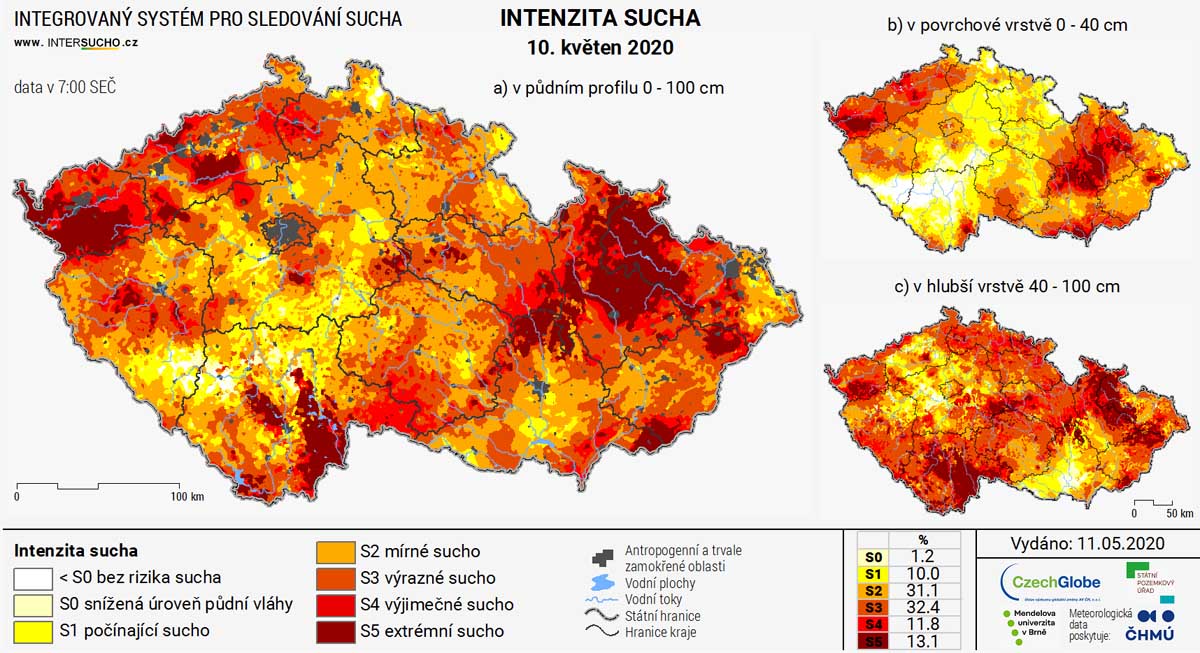 Mapa 1: Nedostatek srážek se v našich krajích více méně držel až do poloviny května (www.intersucho.cz)