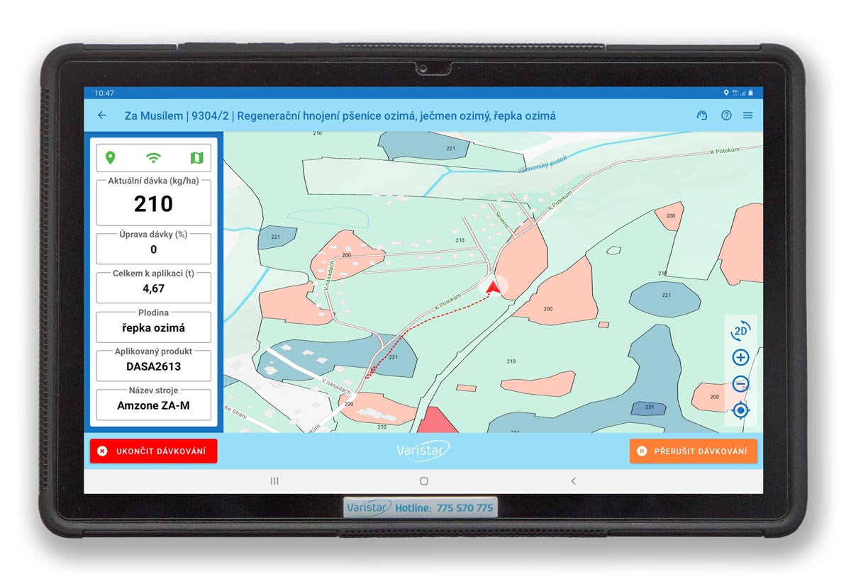 - zobrazení informací o poli a aplikované dávce přímo na obrazovce.