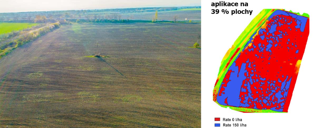 Obr. 1: Příklad cíleného provedení herbicidního zásahu dle podrobného snímkování zaplevelení vytrvalých plevelů (pcháč rolní) z dronu; na základě podkladové mapy zpracované společností Skymaps, s. r. o. bylo provedeno ošetření na 39 % plochy pozemku (namísto celoplošné aplikace)