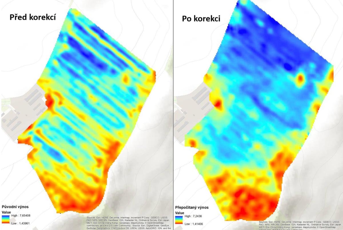 Kromě chybových záznamů může být problematické také zpracování záznamů z více sklízecích mlátiček provádějících současně sklizeň na jednom pozemku, obzvláště pokud se rozcházejí v kalibraci výnosoměrného čidla. Logicky nelze porovnat množství sklizeného zrna zaznamenaného oběma stroji na stejném místě, lze ale po přepočtu na relativní hodnoty výnosu vypočítat odchylku hodnot sousedících přejezdů v obdobných výnosových zónách (nízký, střední a vysoký výnos) a provést vyrovnání obou datových souborů. Vynásobením relativních hodnot průměrným výnosem zrna za celý pozemek zjištěným při odvozu zrna na posklizňovou úpravu pak lze získat výnos v absolutních hodnotách. Automatizace tohoto postupu v GIS usnadnila zpracování výnosových map z rozdílných značek sklízecí techniky pro cca 3 700 ha zrnin na 160 pozemcích sklizených v roce 2019 ve společnosti Rostěnice, a. s. s minimalizací ručního zpracování jednotlivých pozemků. V rámci experimentálního vývoje byly pro porovnání záznamů využity také družicové snímky Sentinel-2 pořízené před dozráváním plodiny, kde lze identifikovat odchylky sklízecích mlátiček na relativně vyrovnaných místech porostu.