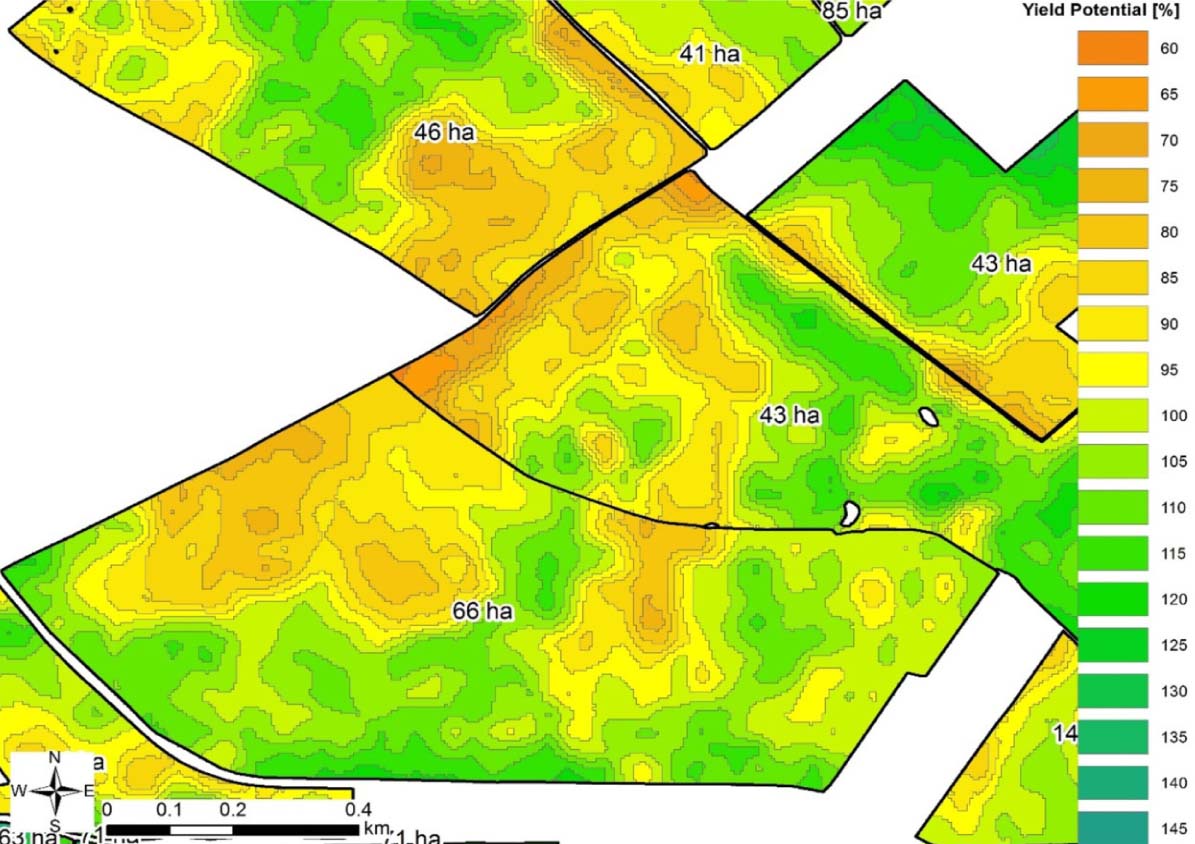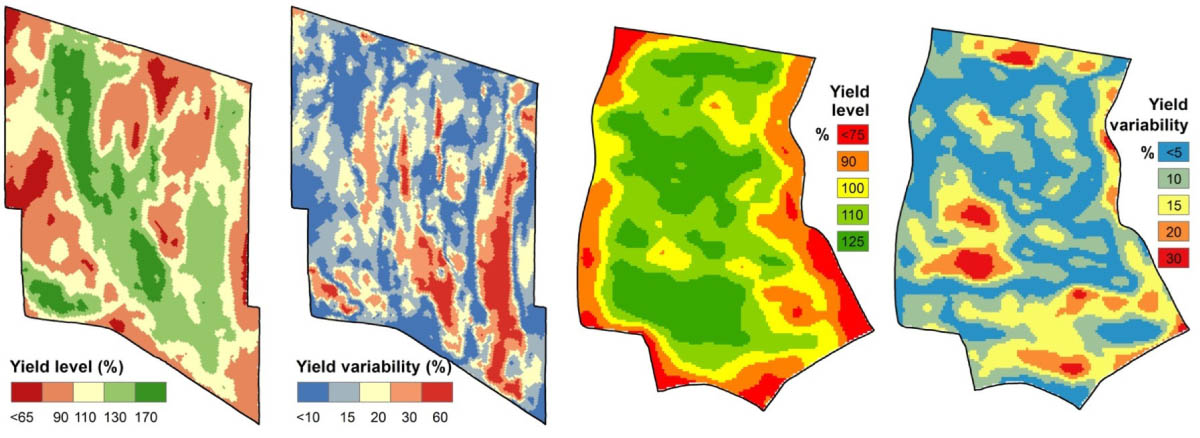 Významná pro agronomy je také znalost mezi-ročníkové variability výnosových úrovní pro rozlišení ploch se stabilní či kolísavou výnosovou hladinou. V praxi se ale tato informace zatím příliš nevyužívá a je spíše sledována v rámci výzkumných studií. Výsledkem by mohlo být definovaní tří typů zón (mapa 3): zóny s vysokým a stabilním výnosem, kde je dosahováno trvale nadprůměrného výnosu zrna a kde je možné podpořit vyšší intenzitou pěstování (hnojení, ochrana rostlin, apod.). Zpravidla se jedná o oblasti s vyšší dostupností půdní vláhy. Zóny s nízkým a stabilním výnosem představují plochy, kde je vhodné snížit intenzitu pěstebních zásahů, dokud nezjistíme a nenapravíme příčinu výnos limitujícího faktoru. Může se jednat o plochy s trvale sníženou úrodností, degradovanou půdu nebo výsušné části pozemků. Třetí kategorií jsou zóny s nestabilním výnosem. Tato místa se z hlediska pěstebních doporučení jeví jako riziková, výnos je zde výrazně ovlivněn ročníkovými vlivy. Příkladem jsou méně výnosné zamokřené části pozemků, které v suchých ročnících poskytují nadprůměrný výnos.