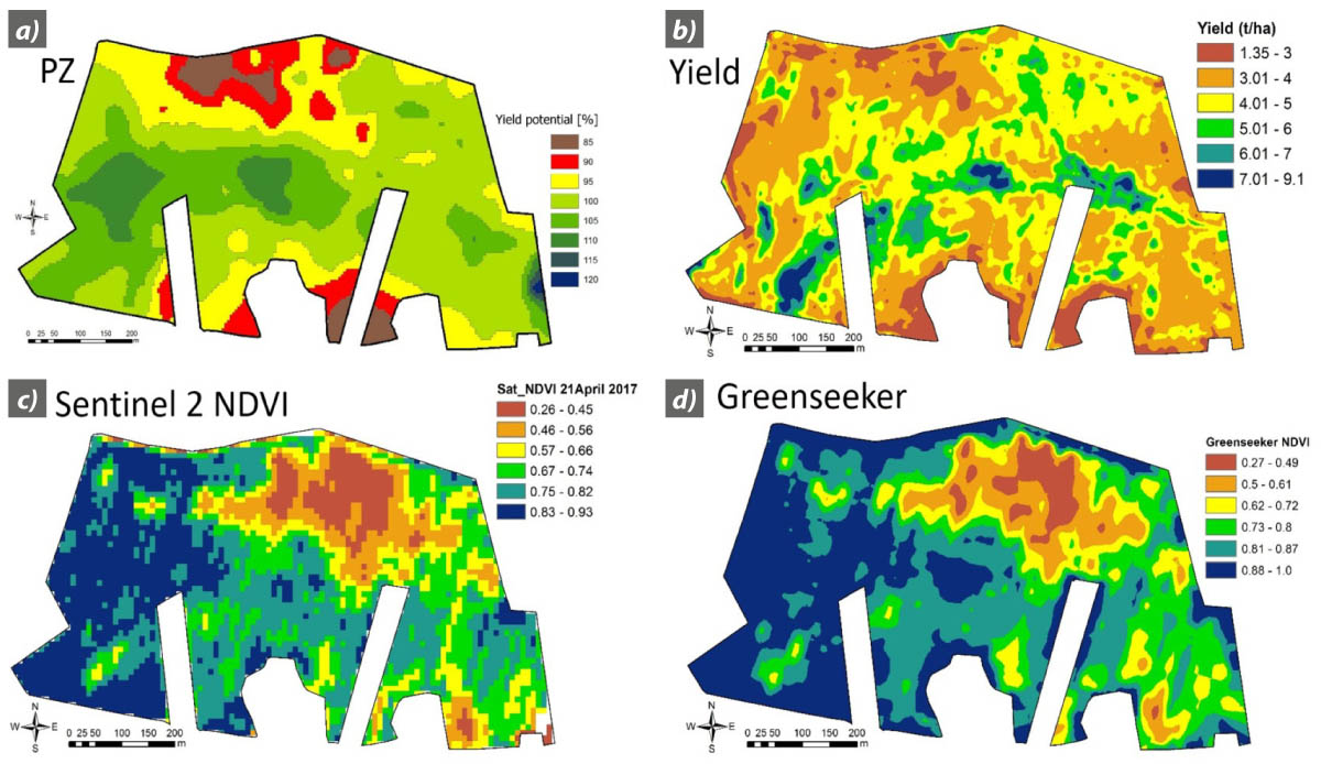 Mapa 5: Příklad mapování nevyrovnanosti 40ha pozemku s pšenicí ozimou ve velmi suchých podmínkách (Dolní Dubňany - Dukovany, 2017); zatímco mapa produkčních zón (a) z časové řady družicových snímků vykazuje obdobné členění méně výnosných zón jako výnosová mapa (b) z toho roku, aktuální stav porostu hodnocení pomocí NDVI ze Sentinel-2 (c) a senzoru Greenseeker (d) z druhé poloviny dubna 2017 vykazoval odlišné rozložení