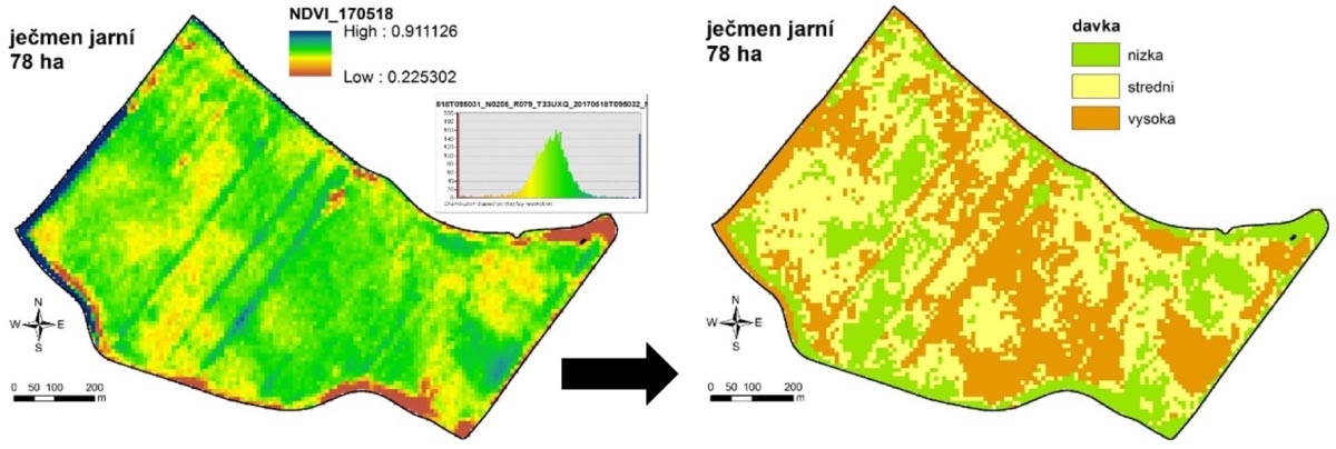 Mapa 7: Příprava aplikační mapy pro ošetření regulátory růstu na základě analýzy NDVI snímku ze Sentinel-2