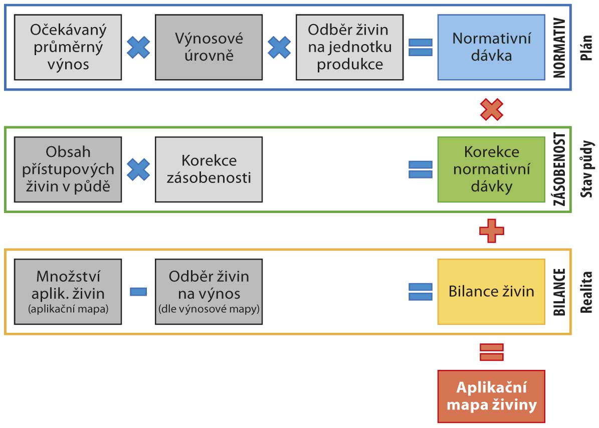 Základem stanovení dávky P, K, a Mg živin je bilanční metoda, kdy jsou do půdy navraceny živiny odebrané ve sklizených produktech. Prvním krokem je určení normativní dávky se zohledněním výnosových úrovní z výnosových map či vymezení zón relativního výnosového potenciálu z družicových dat. Následně je provedena korekce normativní dávky na základě hodnocení obsahu přístupných živin z půdního vzorkování optimalizovaného pomocí metod senzorového mapování půdy. Posledním krokem je zpřesnění bilance živin zohledněním odběru živin z výnosových map poslední sklizně a přísunu živin aplikací minerálních či organických hnojiv v uplynulém období (schéma 1).