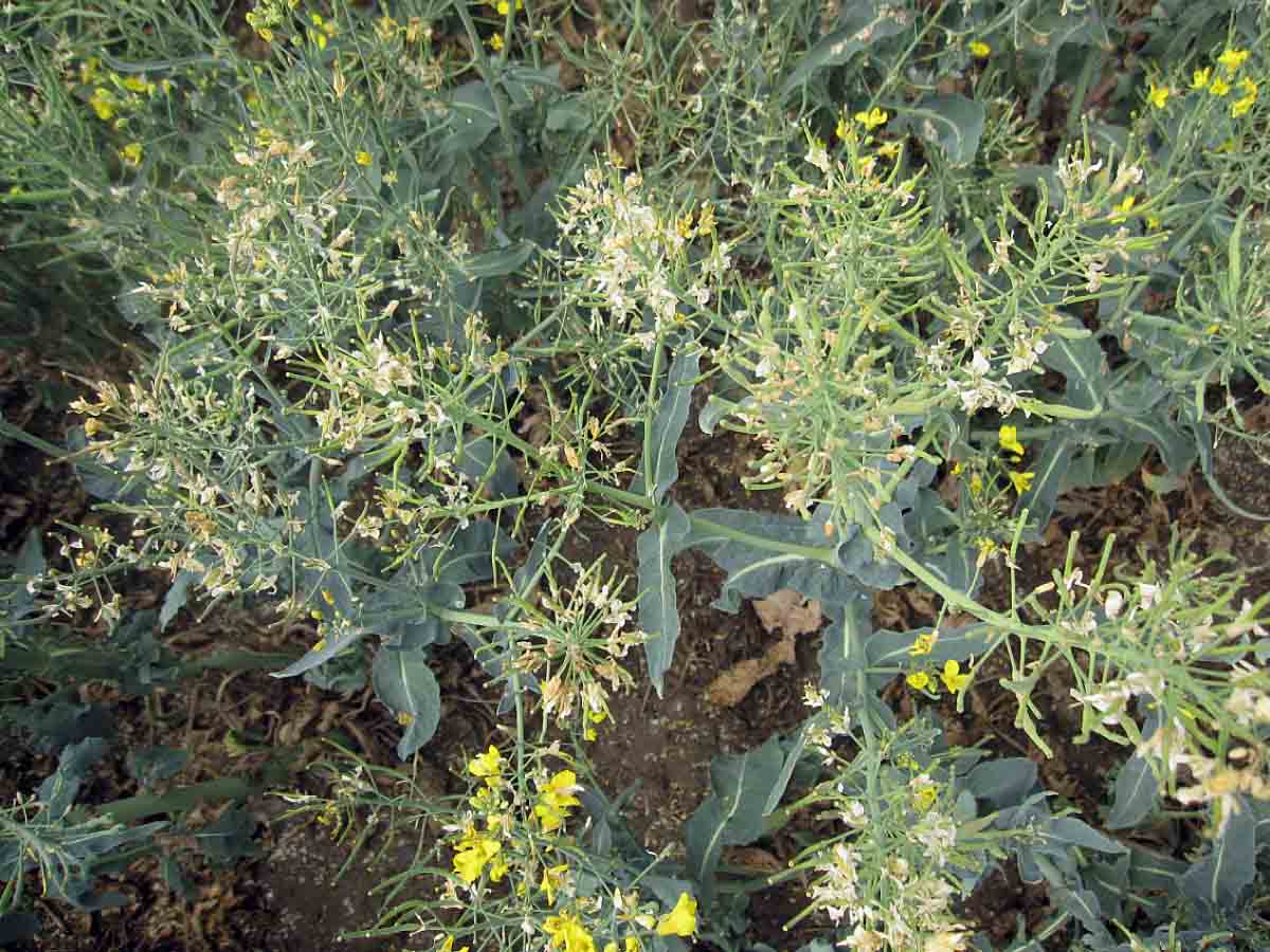 Poškození řepky v jarním období 2020 rovněž souviselo s celkovým vývojem rostlin, který probíhal po celou zimu. Místně se na intenzitě poškození projevila spojitost s provedeným hnojením a postřikem (DAM, regulátory růstu a další) v bezprostřední návaznosti na ranní mrazy. Již na počátku dubna byly sledovány zavadlé a poškozené listy (obr. 12). Jelikož v době dubnových mrazů měly rostliny řepky vidět již vyvíjející se květenství, bylo možné pozorovat nejen usychání částí listů, ale i poškození poupat (obr. 13). Dubnové mrazy rovněž způsobily rozpraskání lodyh rostlin řepky. Květnové mrazy zastihly řepky v plném květu, což se projevilo v poškozeném květenství a vývoji šešulí (obr. 14).