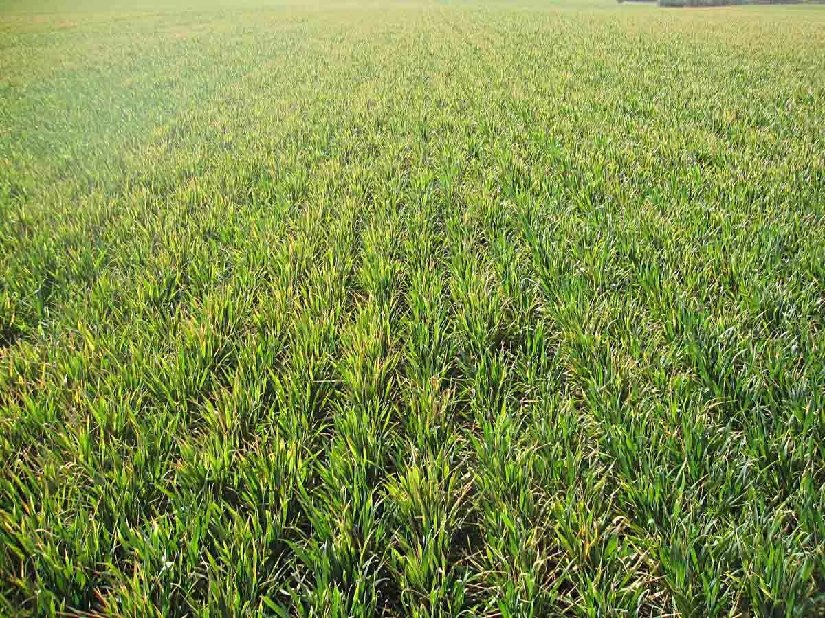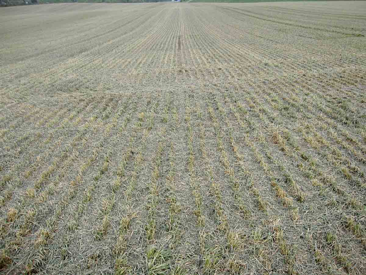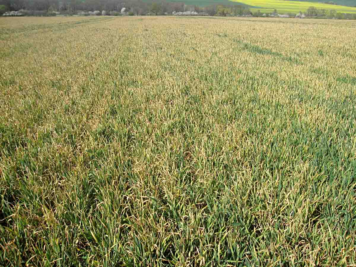 Obr. 6: Porost pšenice s mrazem poškozenými odnožemi