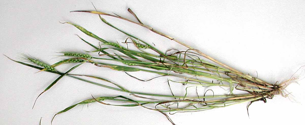 sterilita kvítků, zbělení klásků a osin, poškození dolní části stébla, změna barvy listů |