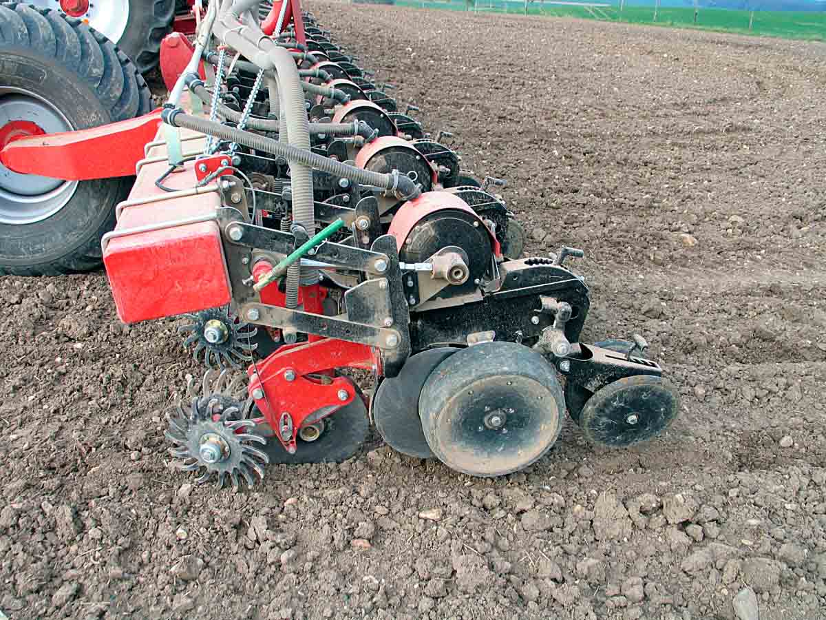 Obr. 2: Secí stroj s dvoukotoučovými secími botkami, opěrnými koly, které působí jako omezovače hloubky setí (umožňují dodržet zvolenou hloubku setí na pozemcích s různým odporem půdy vůči pronikání kotoučů do půdy) a přítlačnými koly; předřazené šikmo postavené kotouče s prsty jsou určeny pro odhrnování rostlinných zbytků do stran v pruzích před vlastními secími botkami