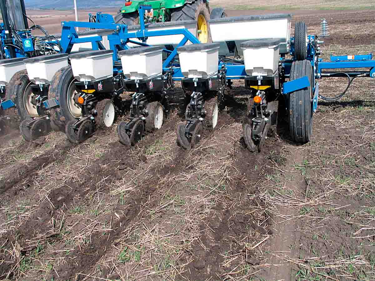 V podmínkách České republiky je využívání půdoochranných technologií s protierozním účinkem zvlášť aktuální při pěstování kukuřice na lehčích půdách. Důležité je, že pro realizaci těchto technologií jsou v současnosti k dispozici vhodné stroje, zejména kypřiče a secí stroje. Na obr. 2 a obr. 3 jsou ukázky secích strojů na přesné setí s kotoučovými secími botkami a omezovači hloubky setí, které jsou vhodné pro setí kukuřice a slunečnice v postupech s výskytem rostlinných zbytků na povrchu půdy v době setí. Secími stroji s klasickými radličkovými secími botkami nelze kukuřici v těchto technologiích kvalitně zasít. Výhodou secích strojů uvedených na obr. 2 a 3 je jejich široká použitelnost - mohou být využity jak v minimalizačních a půdoochranných technologiích, tak v postupech konvenčního zpracování půdy s orbou. Pro zapravení minerálních hnojiv do půdy současně se setím jsou využívány kotoučové pracovní nástroje.