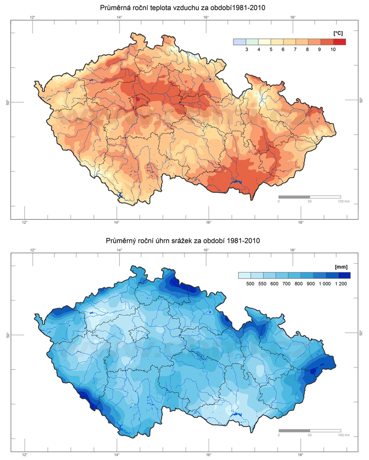 Mapa 1: Teploty a srážky na území České republiky (1981–2010, ČHMU)
